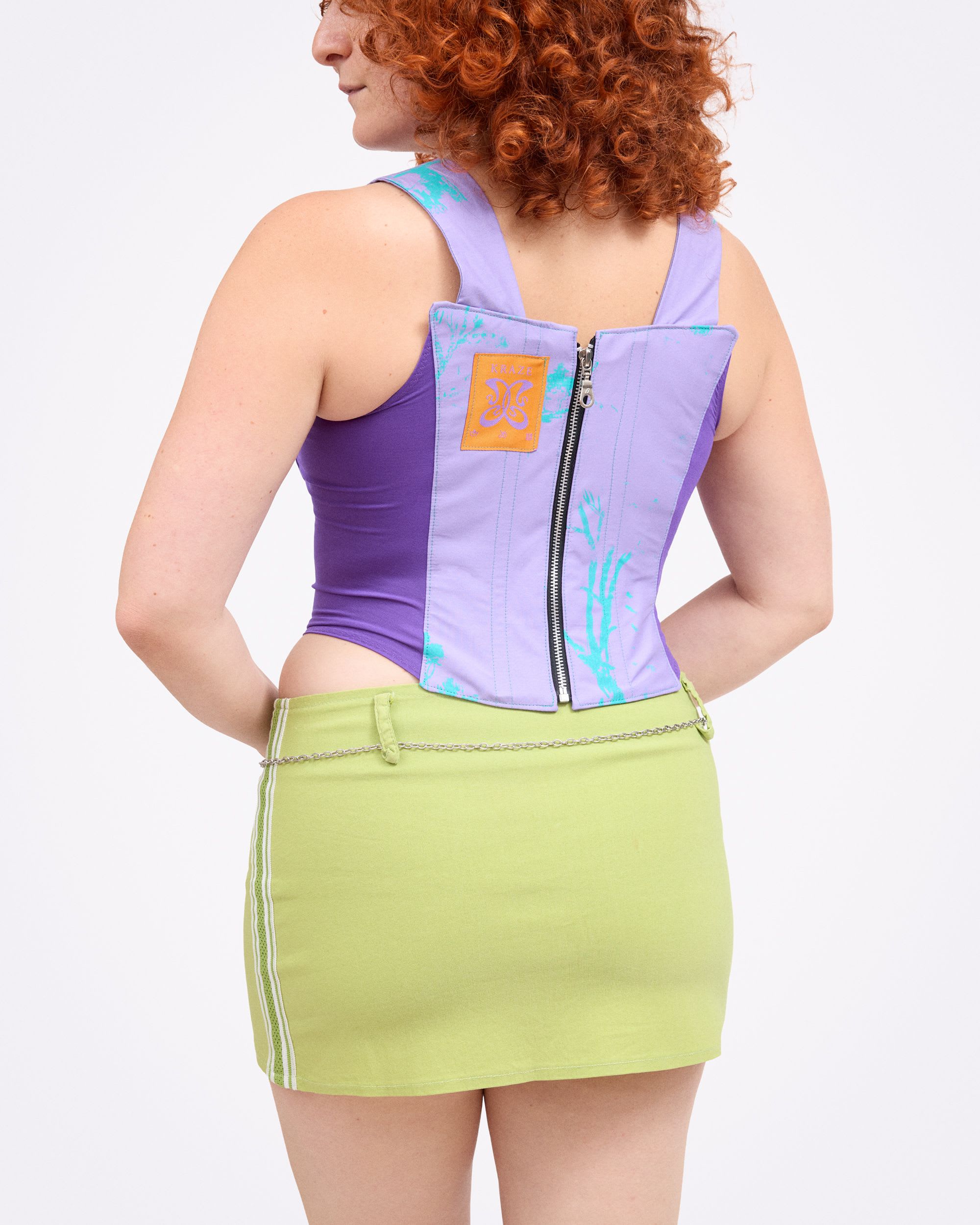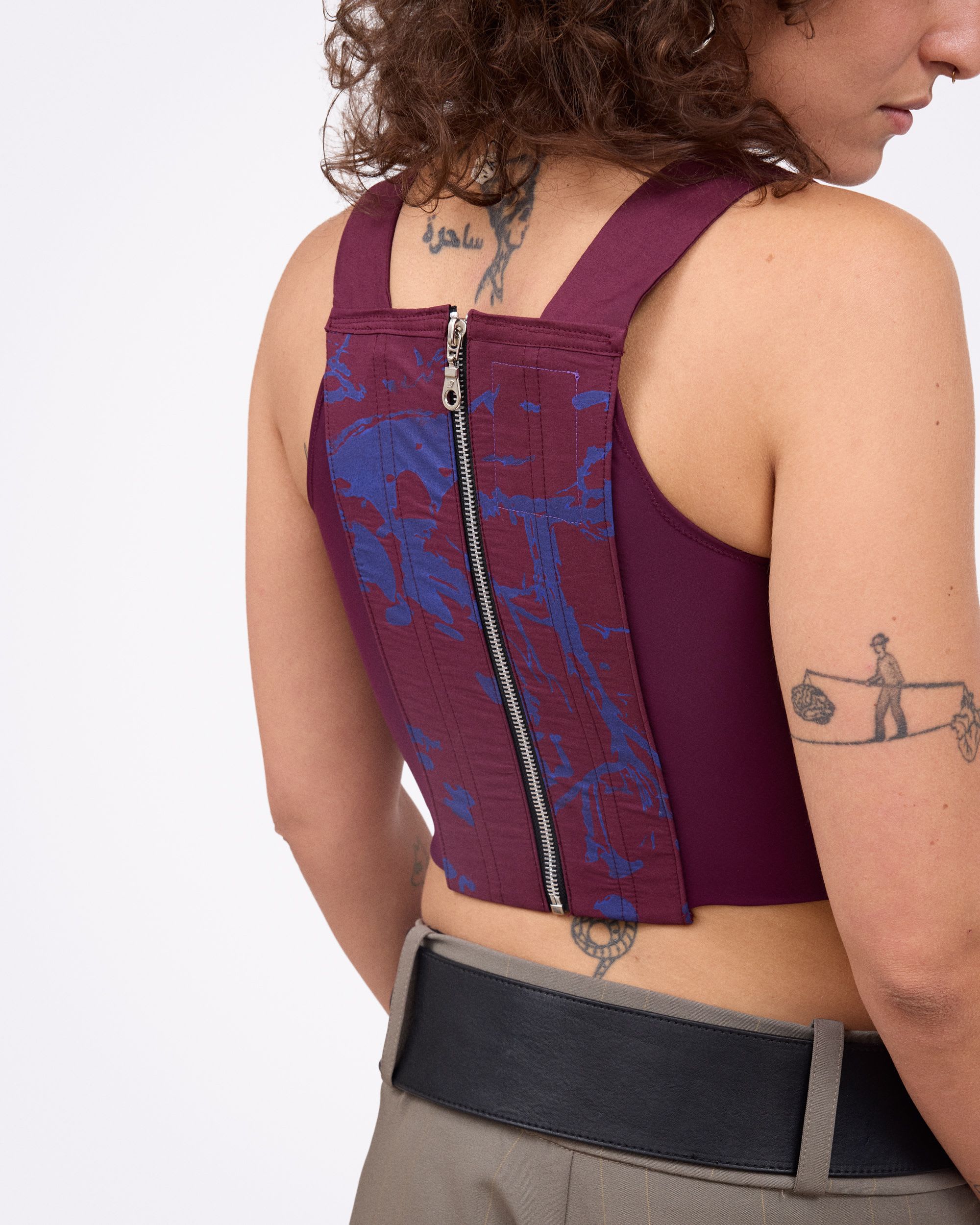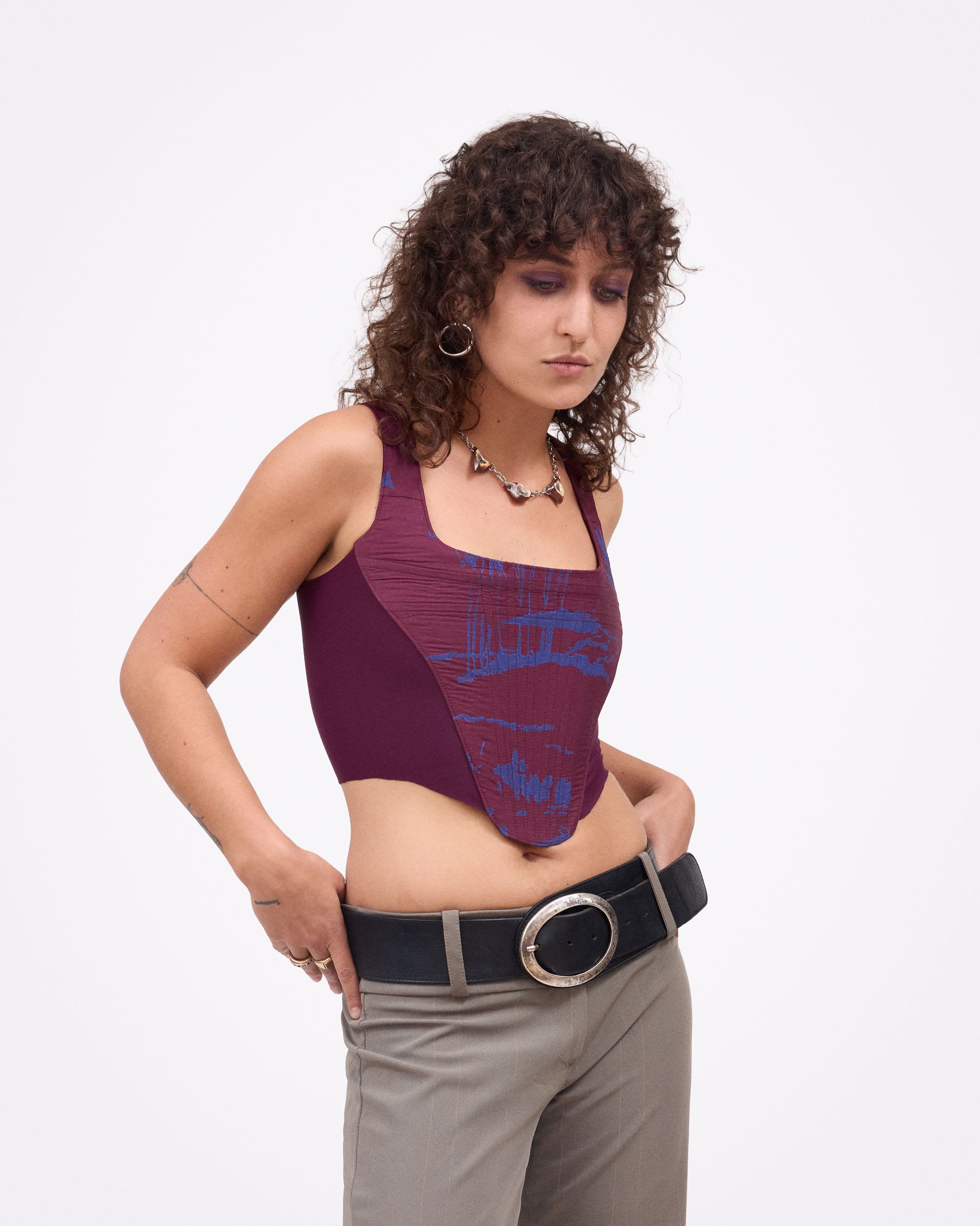 L'imprimé est sérigraphié maison à partir d'une matrice pour papier peint récupérée par mon grand-père. Il représente des moulins et des bocages. Chaque vêtement a une parcelle visuelle différente. Mariana Enriquez, l'écrivaine argentine. Sérigraphier évoque le palimpseste, l'écriture sur du velin gratté et effacé. Son oeuvre fait coexister réalité psychologique et infra-monde magique.